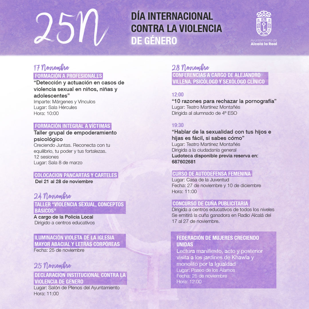 El día 25 se leerá la Declaración Institucional contra la violencia de género, a las 11h en el Salón de Plenos, como siempre consensuada en el Consejo Municipal de Igualdad. Ese día se iluminarán de violeta la Iglesia Mayor Abacial y las letras corpóreas del ferial. A las 12h la Federación de asociaciones de mujeres “Creciendo Unidas” dará lectura a un manifiesto y posteriormente se hará una marcha hasta el monolito por la Igualdad, haciendo una parada en los jardines de Khawla.