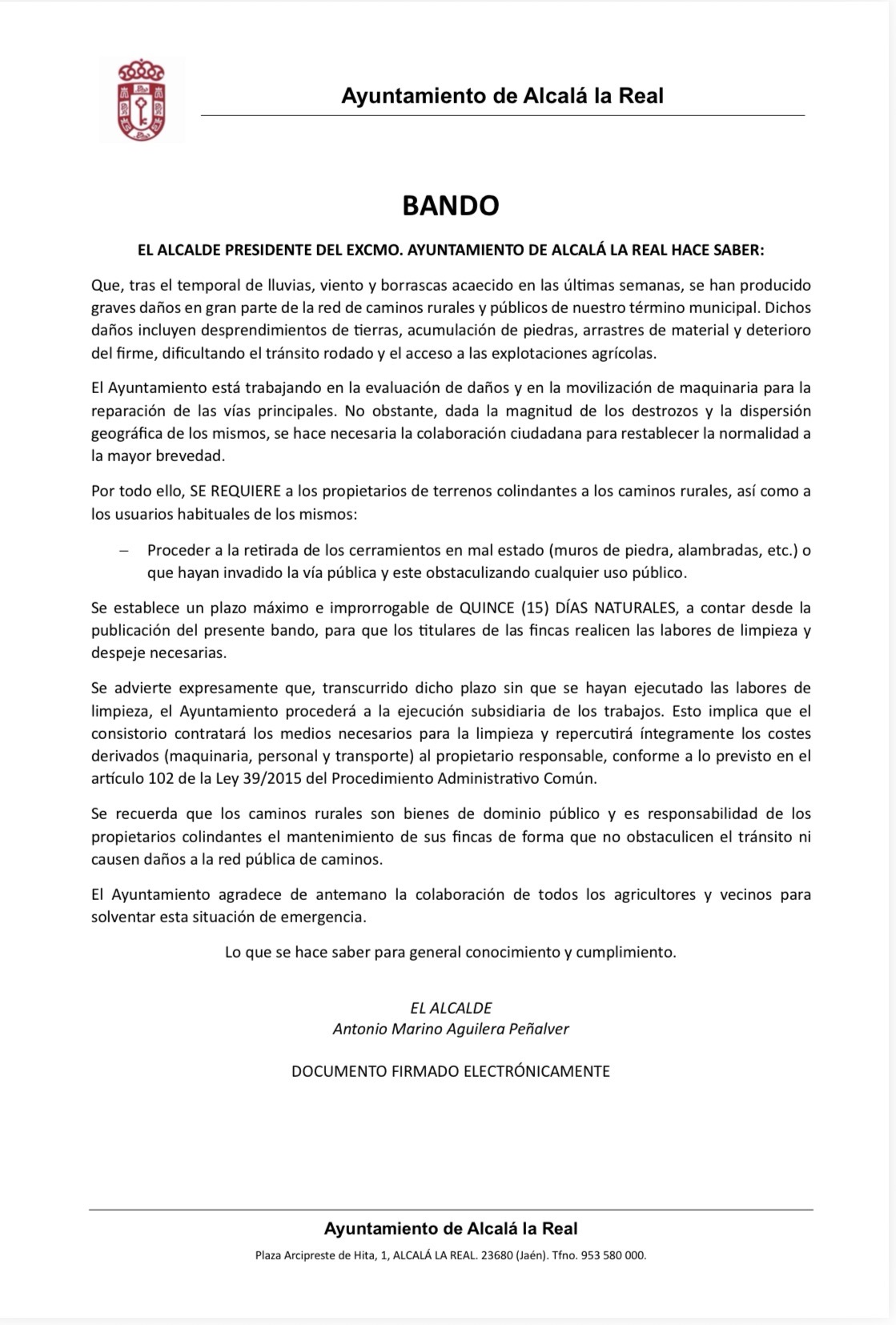 El alcalde, Marino Aguilera, ha dictado un Bando municipal ante los graves daños ocasionados en la red de caminos rurales y públicos del término municipal como consecuencia de los temporales de lluvia y viento registrados en las últimas semanas.
